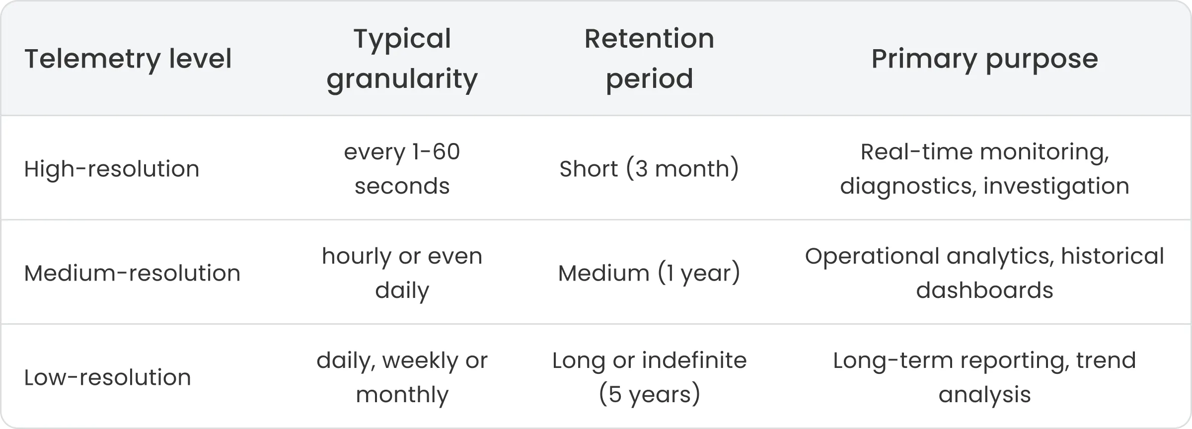- Limit raw telemetry retention: Keep high-frequency raw data for diagnostics and investigation, but avoid retaining it longer than required for operational needs.