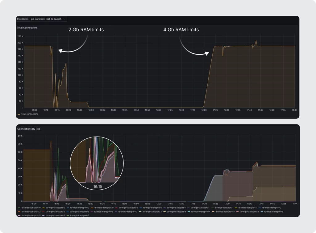- Memory constraints in MQTT transport services — resolved by increasing memory allocations to support higher connection density.